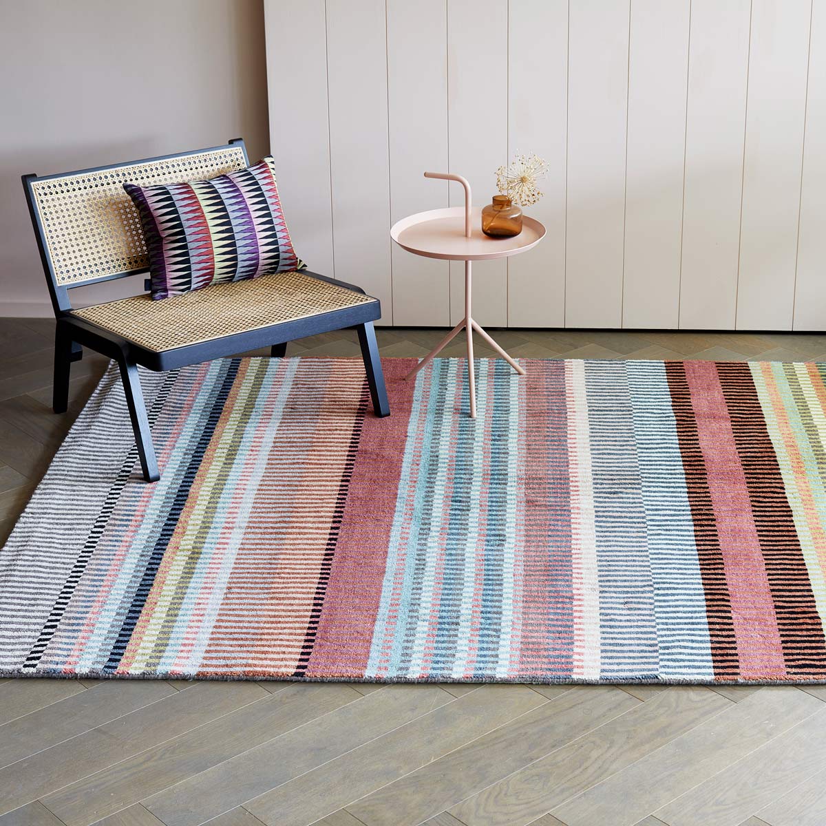 The Canterbury rug is a multi coloured textural stripe, woven as a warp faced rug. The design incorporates 12 curated colours, carefully chosen to complement and contrast with each other to create a vibrant yet versatile product.