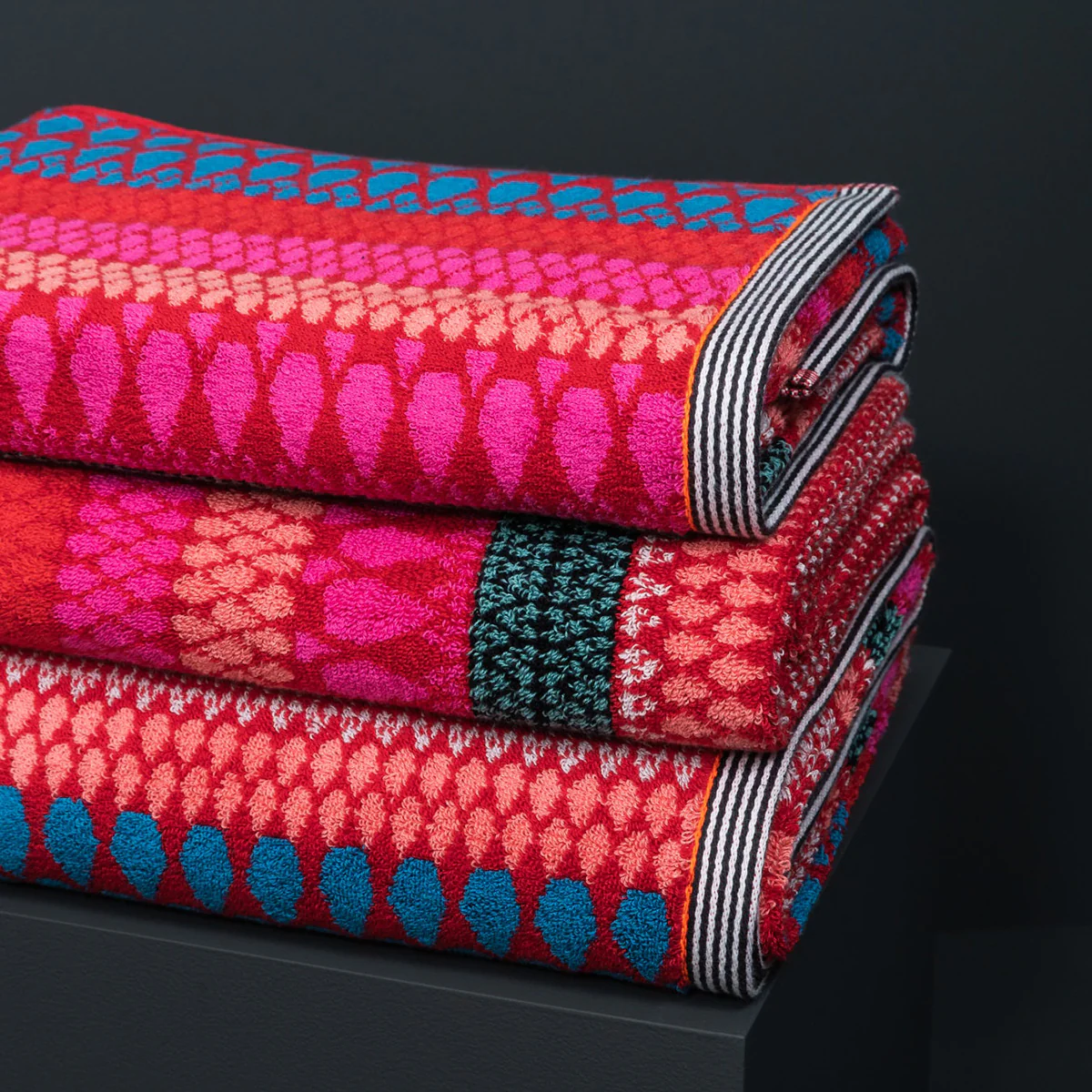 The Faversham design is a graphic geometric pattern. Combining inspiration from the rhythmic shapes found in both cut glass and Fairisle patterns, these sumptuous cotton towels provide an instant splash of colour.