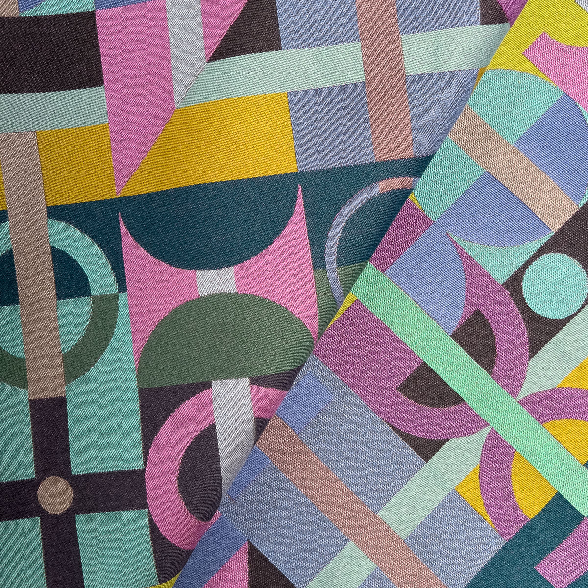 The design for Flux fabric, like the original colourway Motion, references the Johnston typeface, and archival material in the collection of London Transport Museum: tube maps, posters and paraphernalia. It celebrates the relationship between the fast-moving city at night, modern transport, graphic design and woven textiles.