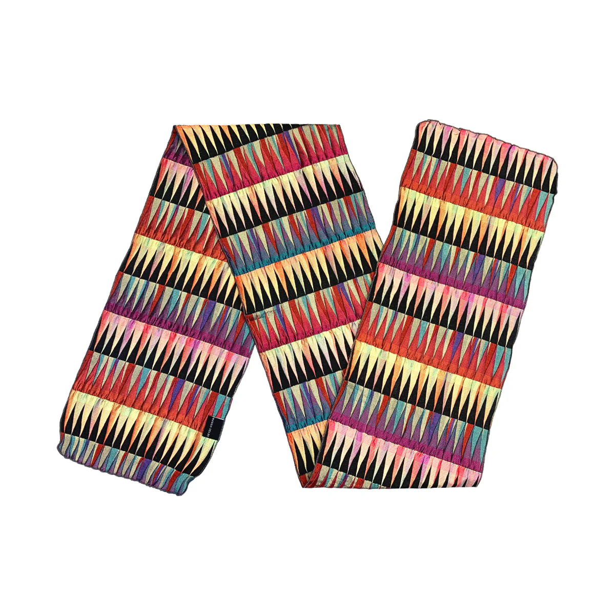 Ison, a harlequinesque kaleidoscope of jewel-like colours, is an iconic piece of apparel – a wearable work of art. This scarf, a cohesive piece of jacquard fabric, is woven in silk with a heat shrink yarn; its double cloth structure creates a unique three-dimensional quality and embossed pattern.