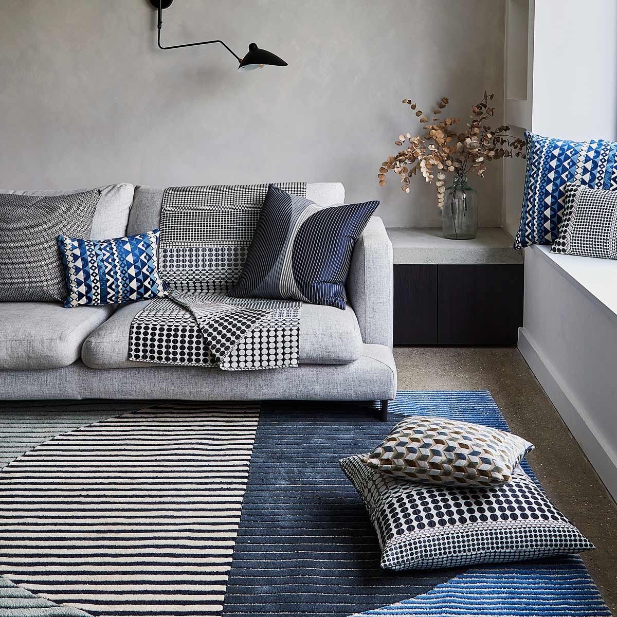 The Logan rug design is made up of a classic Margo Selby motif, used throughout her career - oversized and filled with varying scales of linear pattern. The pattern-within-pattern effect brings smart architectural texture to the floor. The limited palette references the inky tones of traditional Indigo textiles.